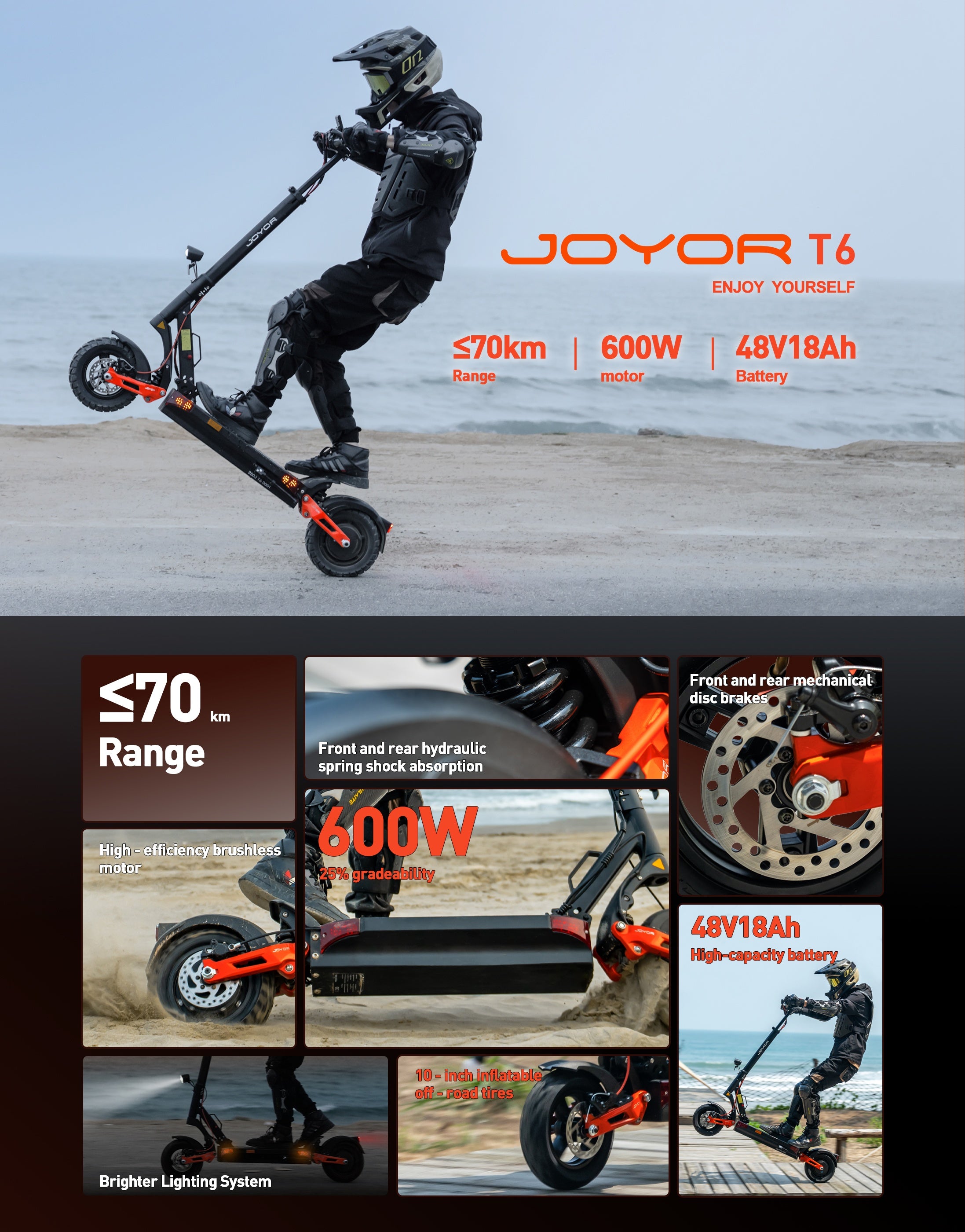 Meet Joyor T6—where power meets freedom. 600W motor, 48V 18Ah battery, 70km range. Conquer 25% slopes, ride any terrain. Built for thrill - seekers and urban adventurers. This is not just a scooter—it’s your ticket to boundless journeys.